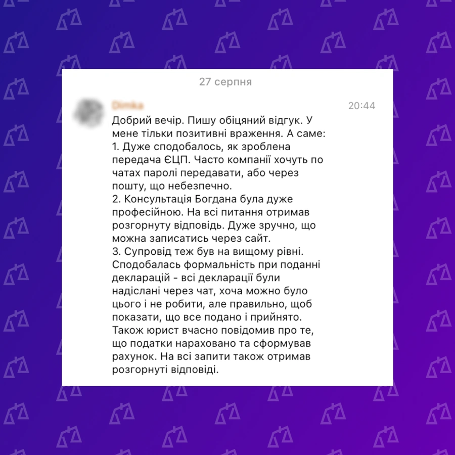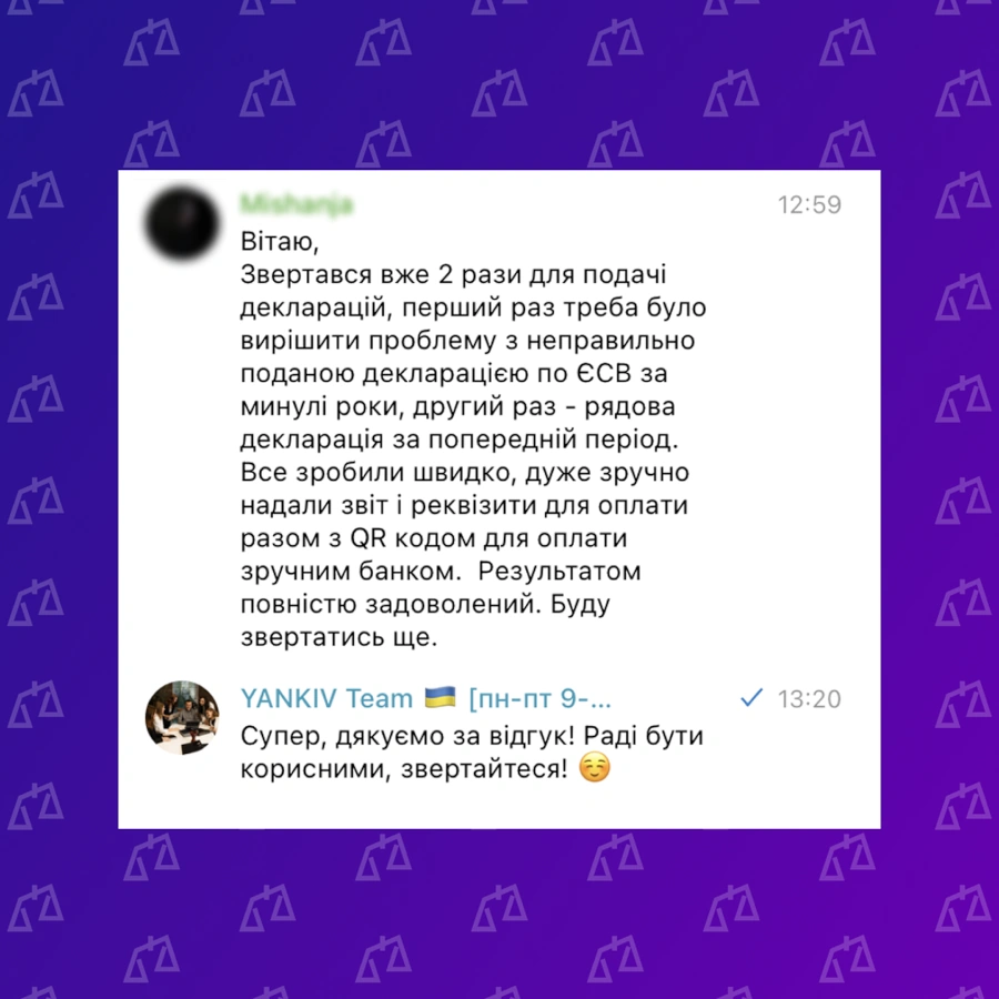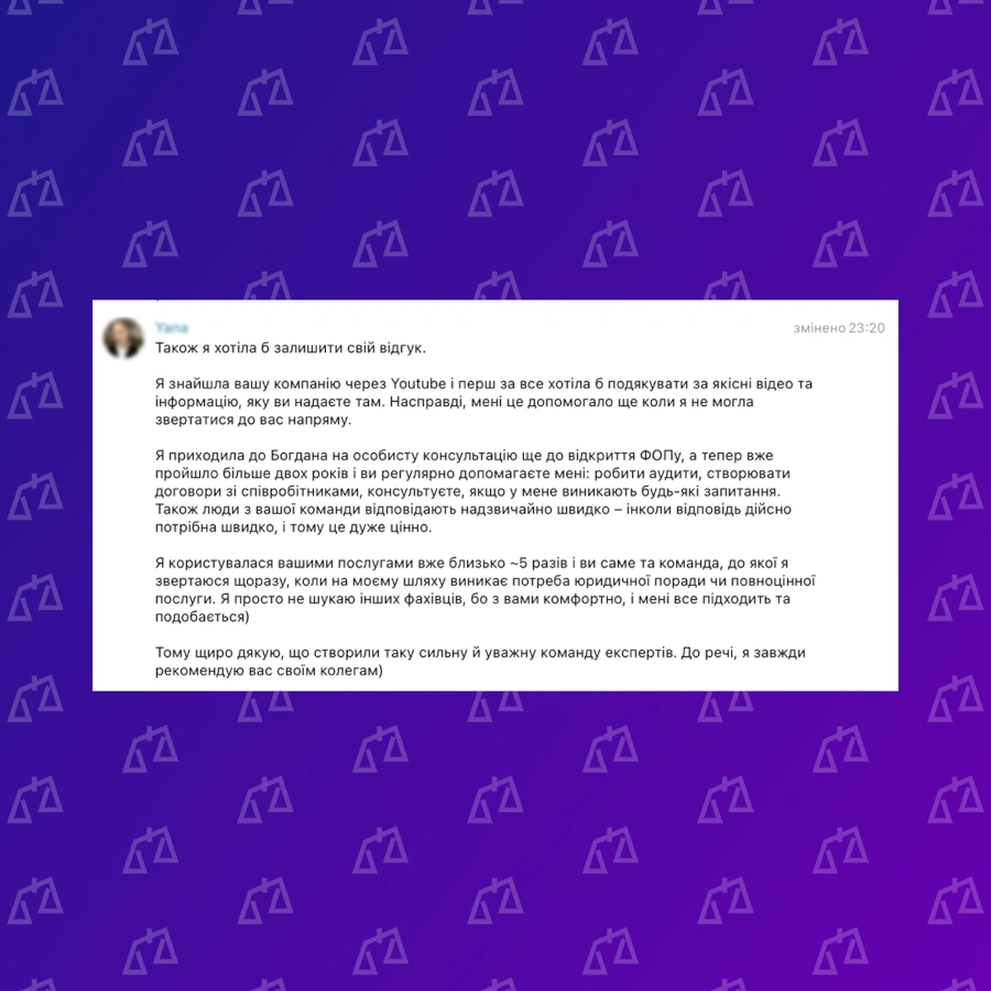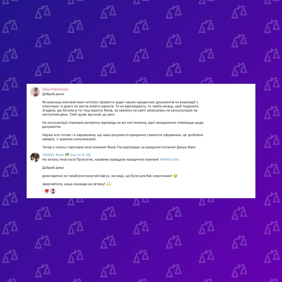 ЮК YANKIV — ваш партнер на всіх етапах! Відгуки про юридичну компанію YANKIV показують головне: ми не просто “юрист”. Від реєстрації ФОП до судового захисту. Від першої консультації до багаторічного абонементського обслуговування. Перегляньте відгуки про юристів YANKIV та кейси — і переконайтеся самі.